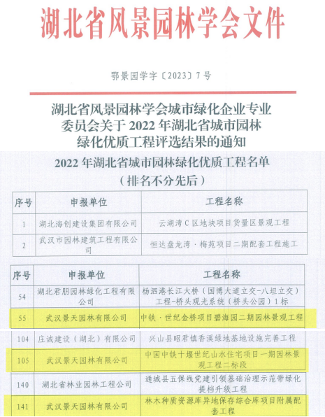 喜訊!林業(yè)集團下屬景天公司榮獲2022年度湖北省城市園林綠化優(yōu)質(zhì)工程獎
