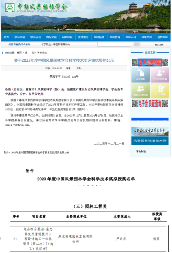 【概要描述】近日,2023年度中國風景園林學會科學技術(shù)獎評審結(jié)果正式公布。由武漢林業(yè)集團下屬湖北美境園林工程有限公司承建的“龜山綜合整治生態(tài)修復及景觀提升工程設(shè)計施工一體化項目”在近千個優(yōu)秀作品中脫穎而出,榮獲中國風景園林學會科學技術(shù)獎(園林工程類)銅獎。